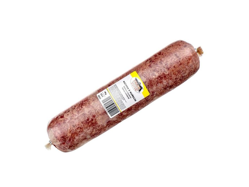 - Kachna včetně kostí 30 %, kachní krky 10 %, kuře včetně kostí 60 %
